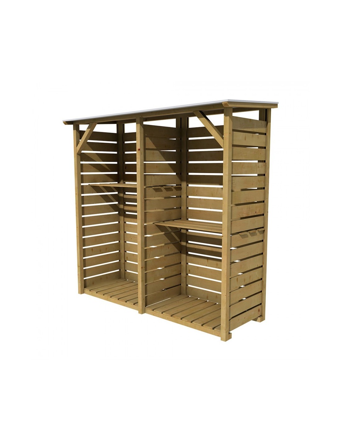 Abri bûches en latte de bois ajourés pour entreposer 2 m³ de bois de chauffage, l’abri est en pin traité résistant aux intempéries.