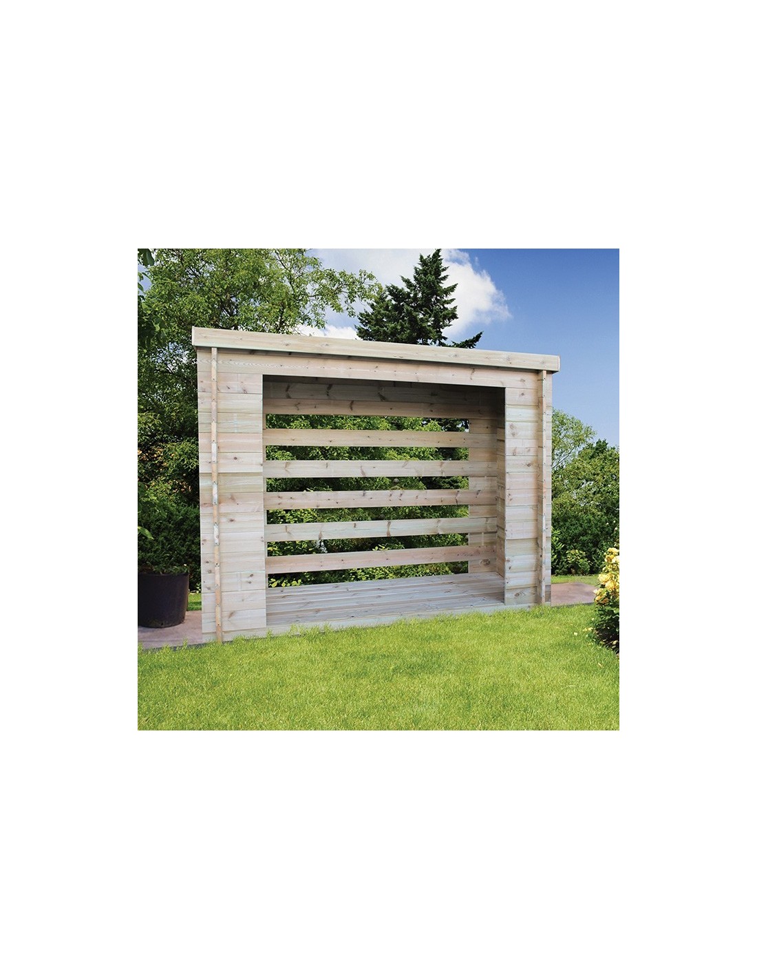 Grand abri bûches pour entreposer +- 6 m³ de bois de chauffage, l’abri est en pin traité résistant aux intempéries.