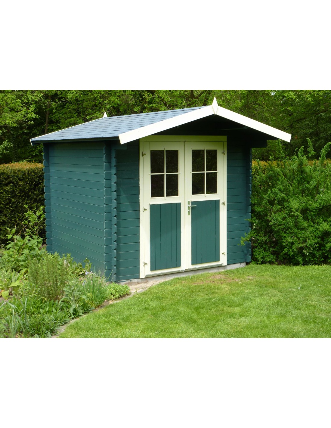 Abri de jardin carré avec double porte vitrée et auvent de 70 cm. D'une largeur de 260 cm sur une profondeur de 260 cm.