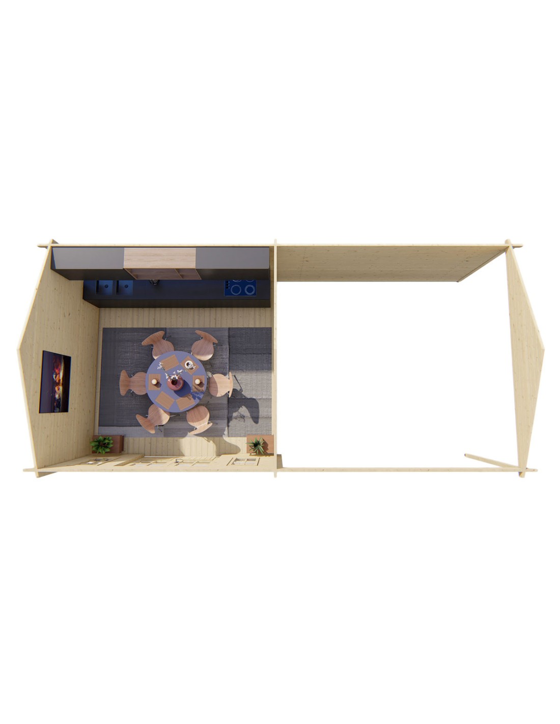 Grand abri de jardin avec espace couvert permettant d'abriter une table et des fauteuils ou même un jacuzzi extérieur. La largeur de l'abri est de 8 mètres et sa profondeur est de 4 mètres.