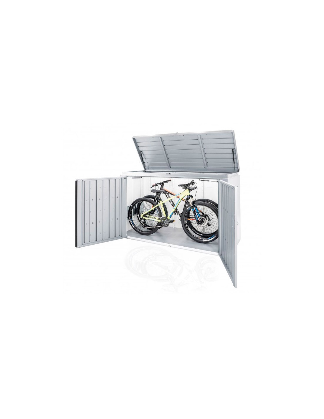 Le garage vélo est disponible en 2 tailles (160 et 200) et 3 couleurs (gris quartz métallique, argent métallique et gris foncé métallique).