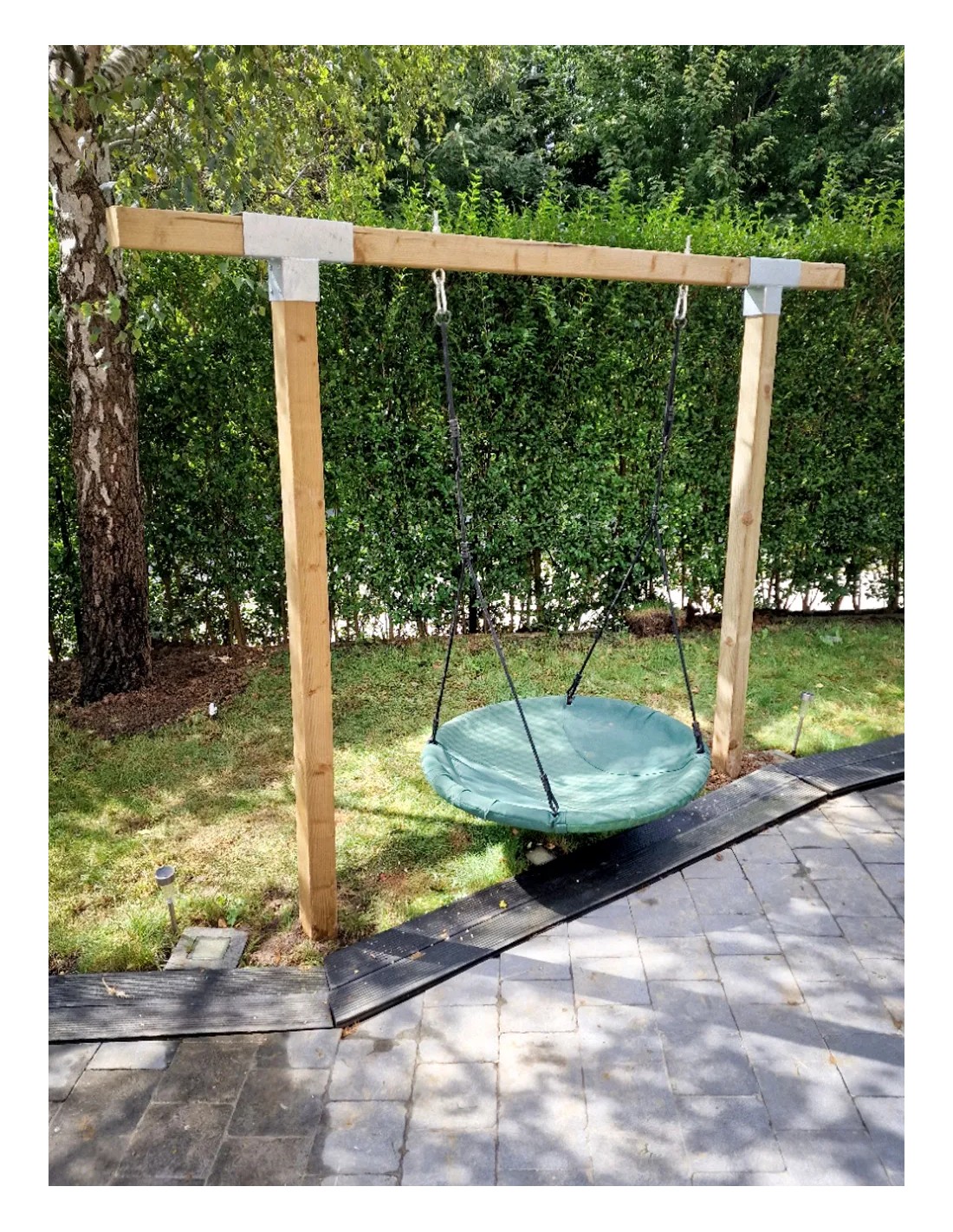 Cette balançoire s’intègre facilement dans les petits jardins, cours ou espaces extérieurs réduits.