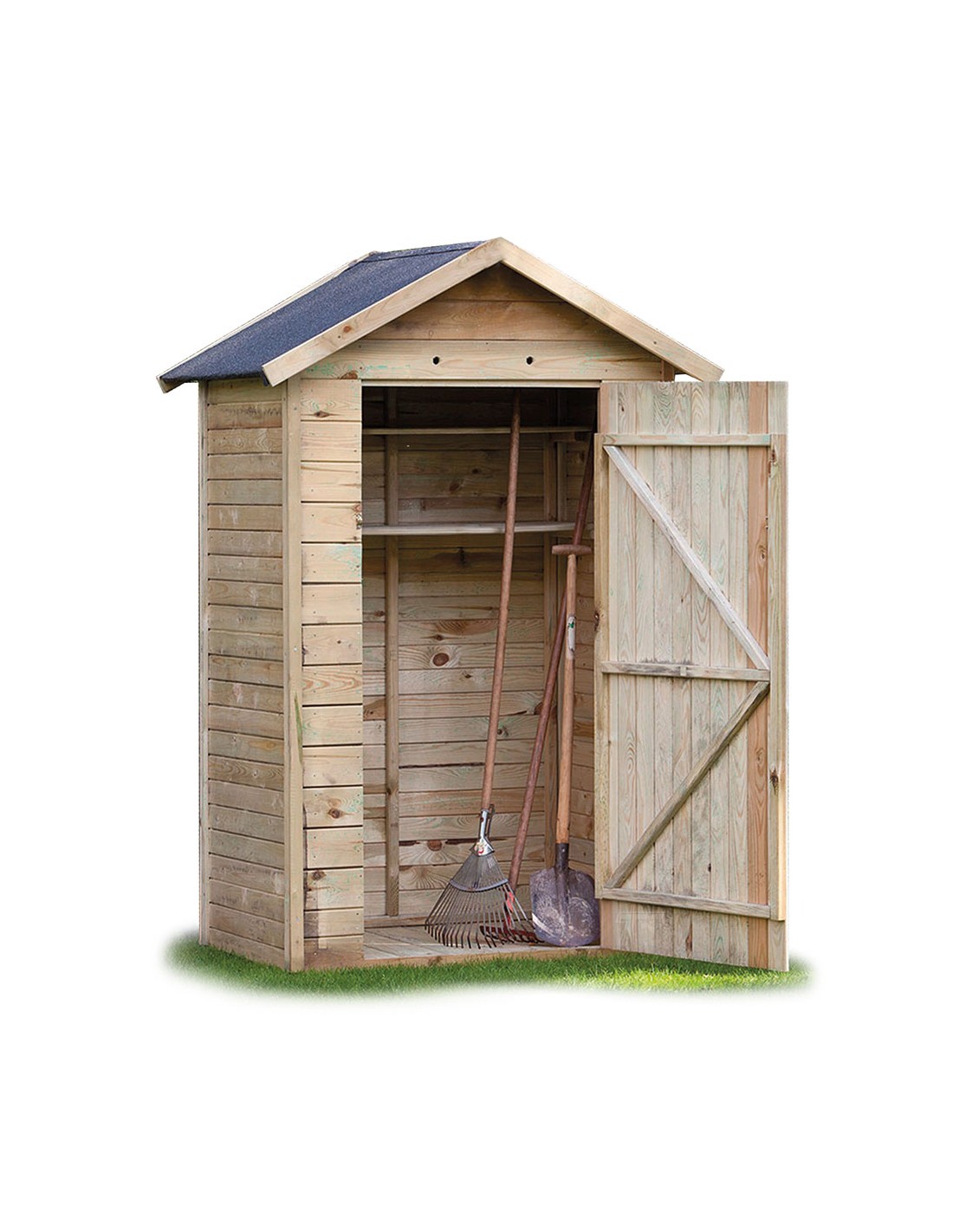Cabane de rangement outils en bois à mettre dans le jardin. La largeur est de 127 cm sur une hauteur de 214 cm et une profondeur de 80 cm.