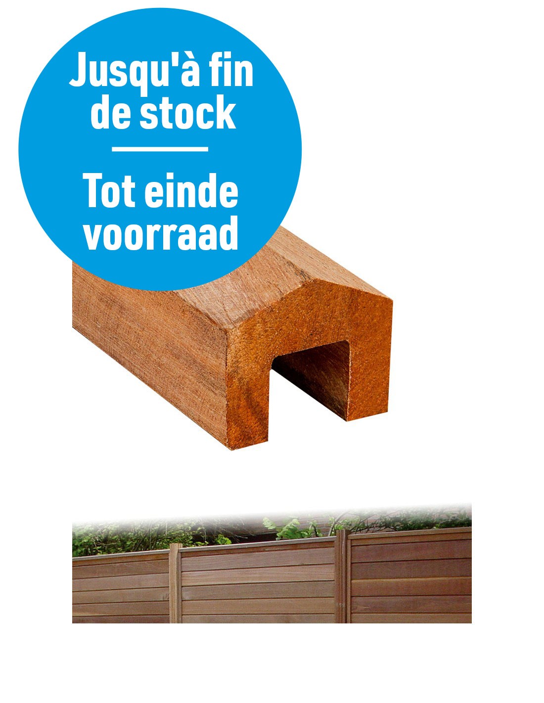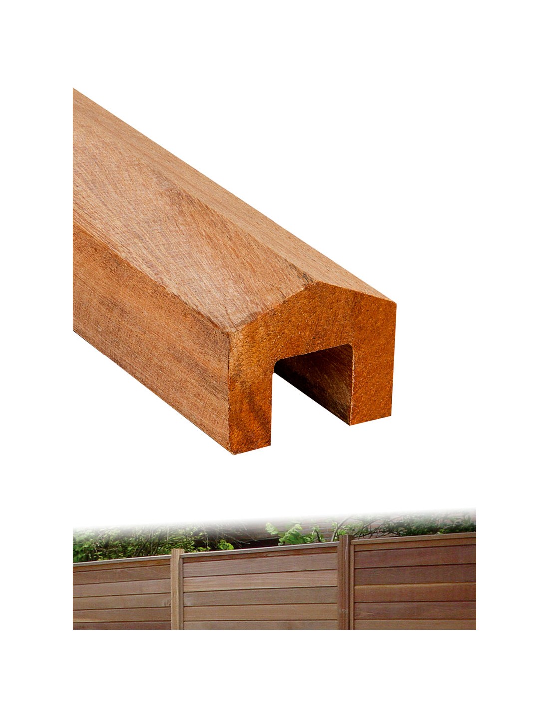 Latte de finition en profil U pointu, de palissade en bois exotique. Longueur 183 cm.