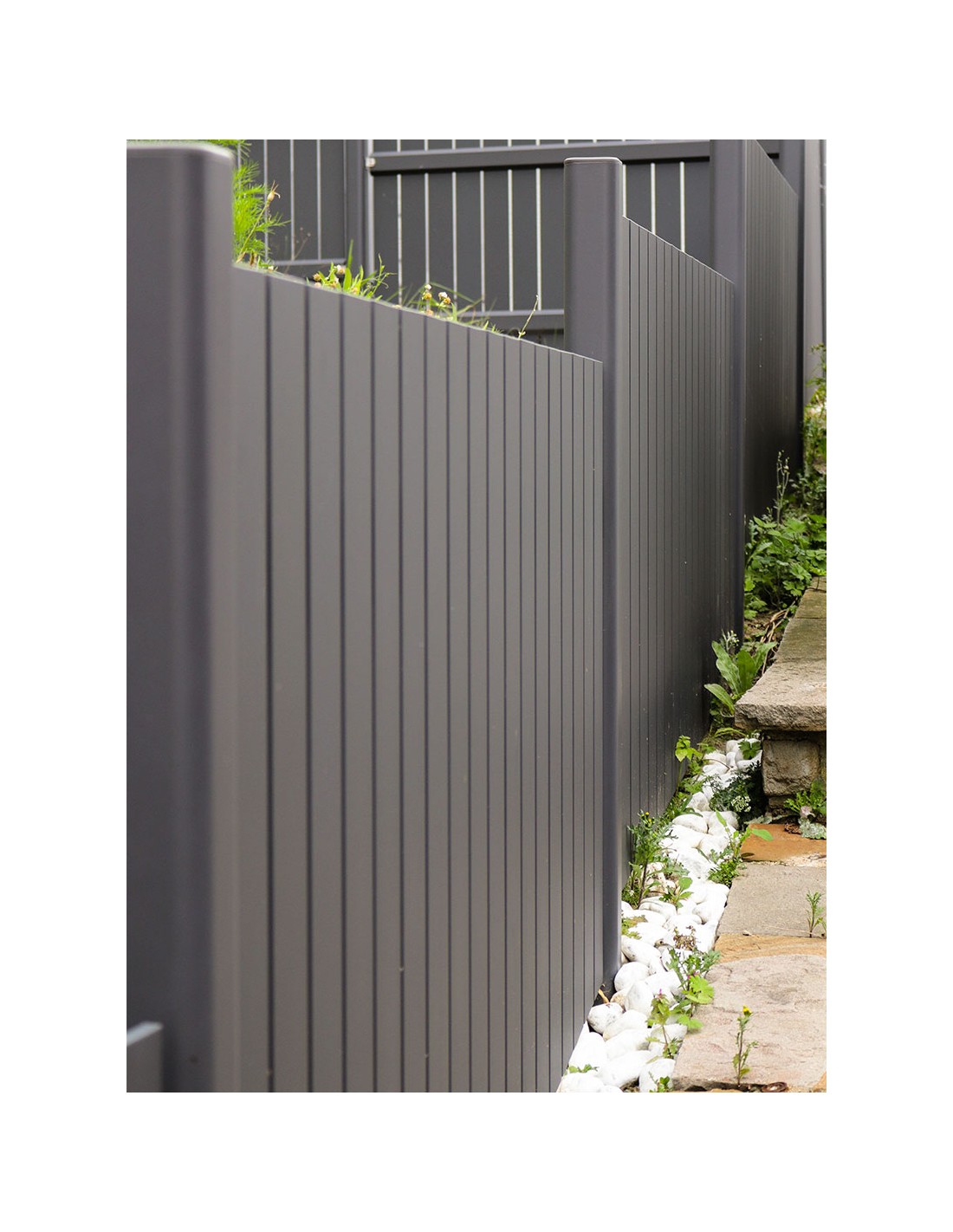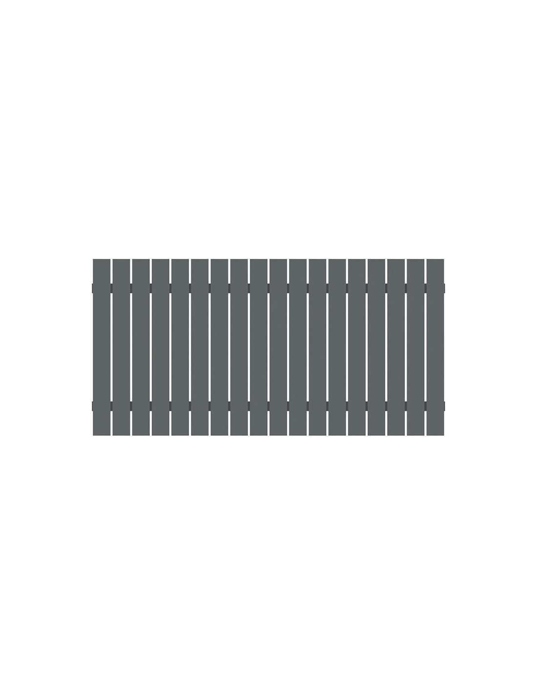 Clôture de jardin basse en aluminium, 180 cm de large et 90 cm de haut. Les lames sont en aluminium thermolaqué et disposent de capuchons PVC de la même couleur.