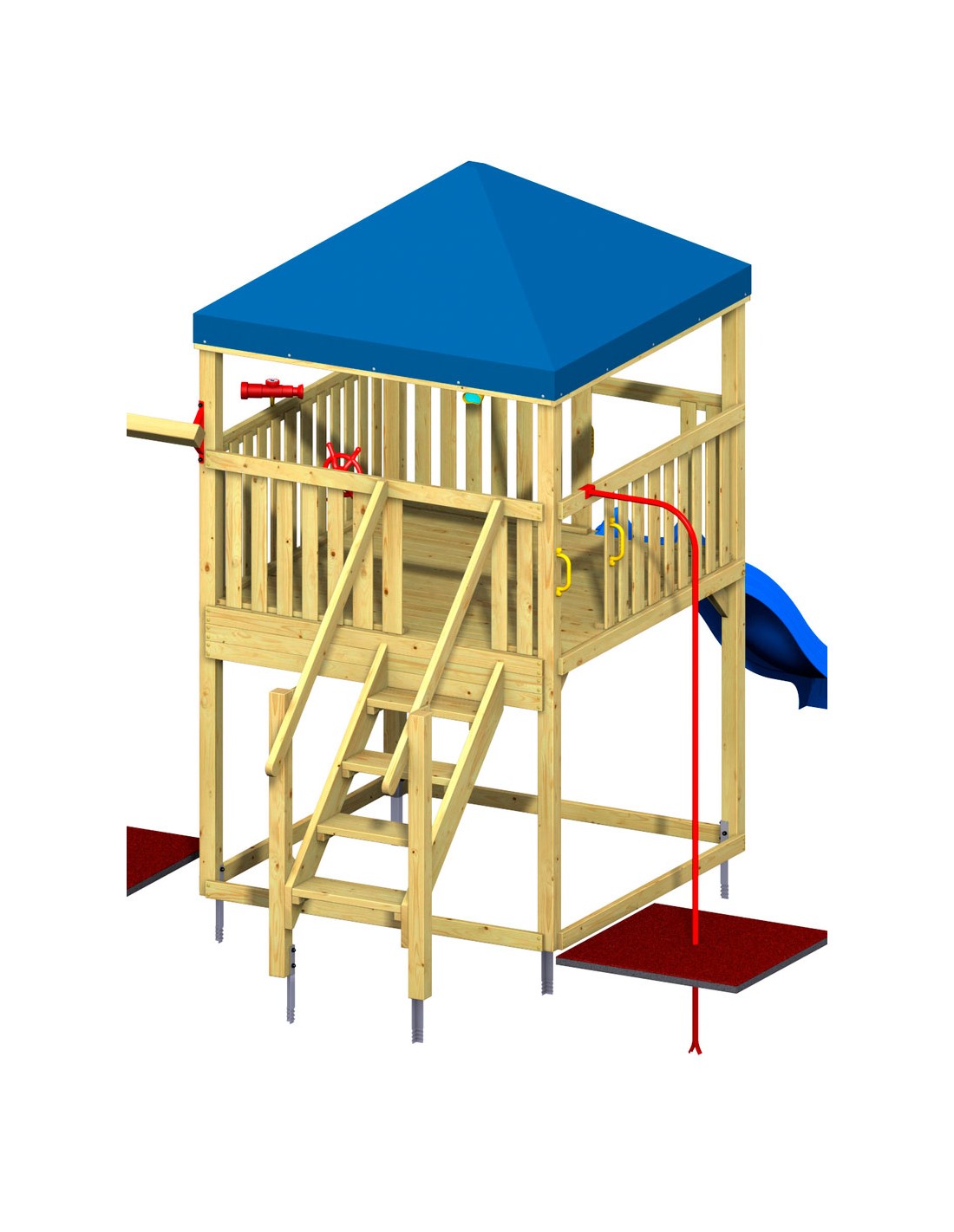 Escalier en bois à monter sur la tour de base Giga et la tour de base de jeux. Pour le montage, deux poutres de système supplémentaires sont nécessaires ainsi que deux ancrages au sol Safety Plus pour la fixation dans le sol.