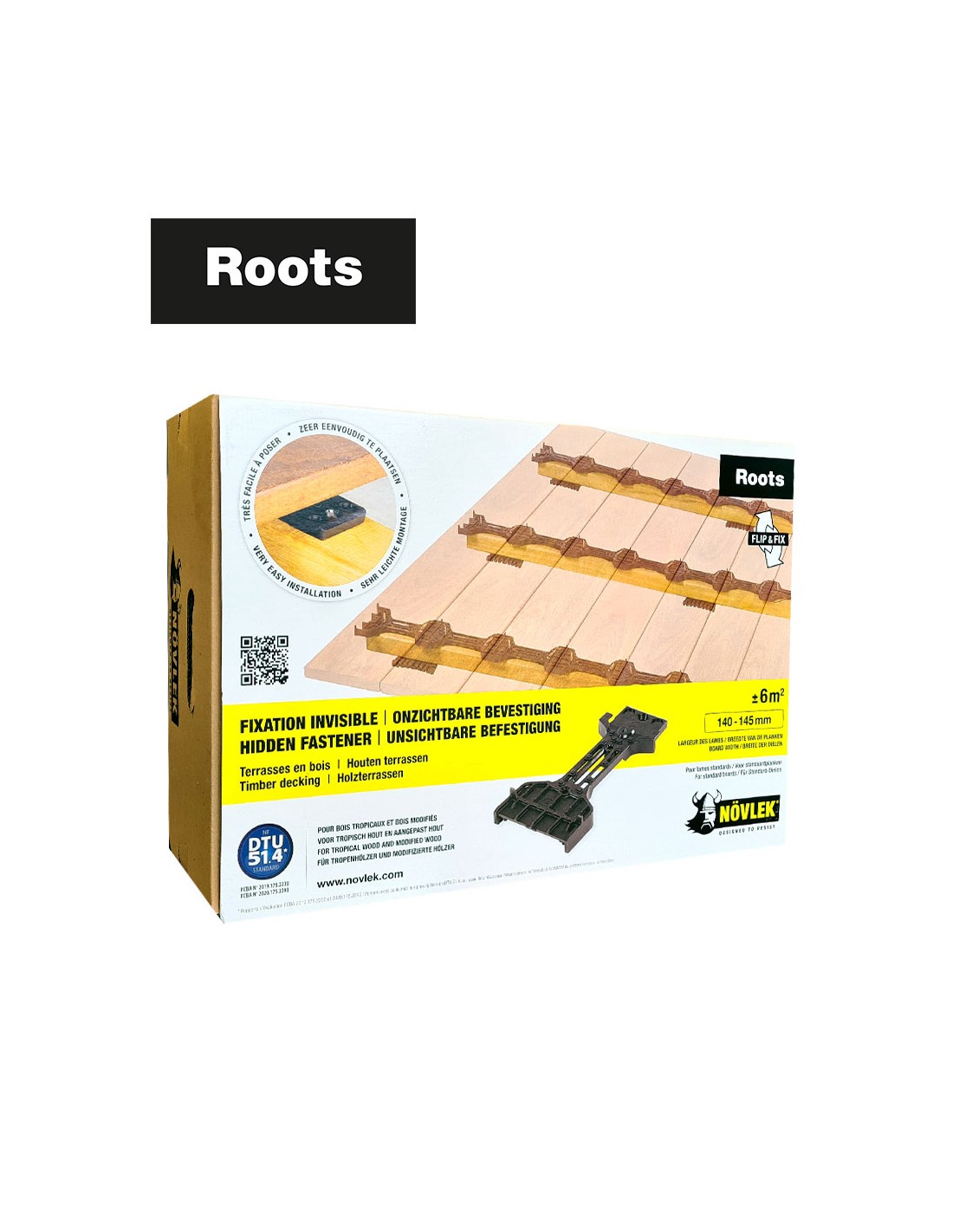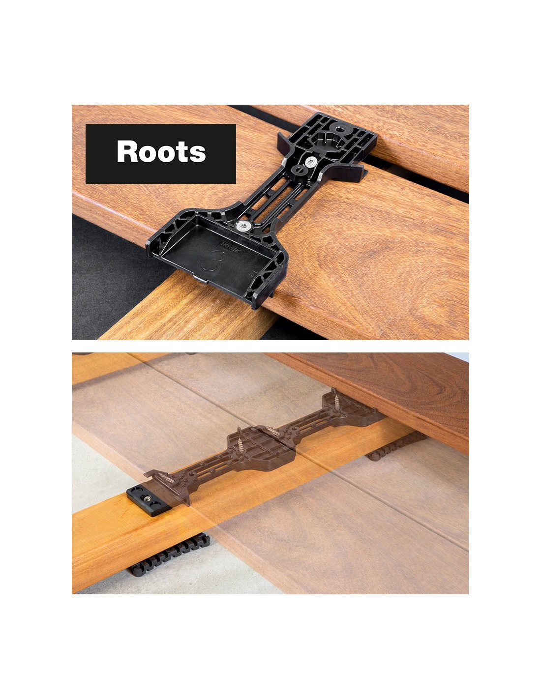 Le système de fixation invisible Roots apporte une véritable innovation dans le domaine des fixations invisibles pour terrasses en bois. La fixation Roots se pose sur le dessous des lames de terrasse standards, sans profil spécifique.