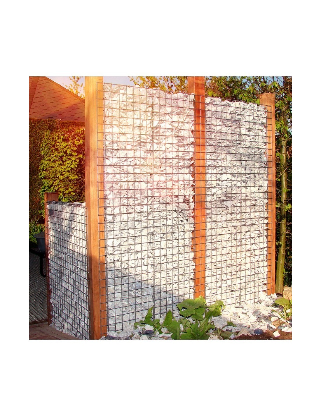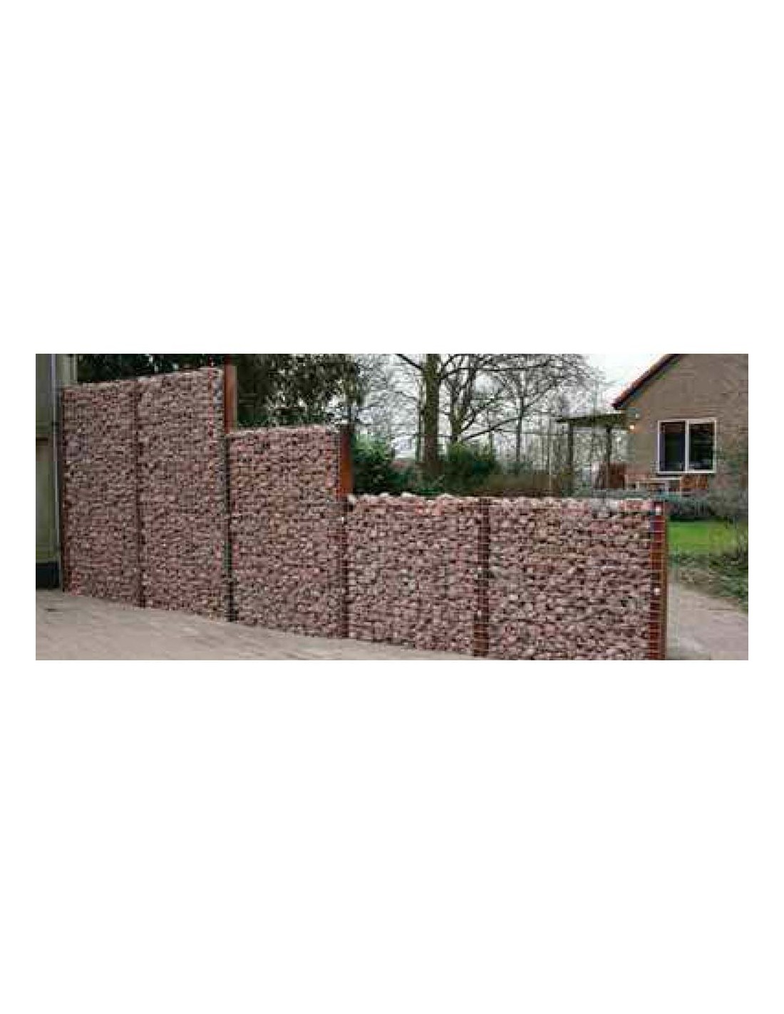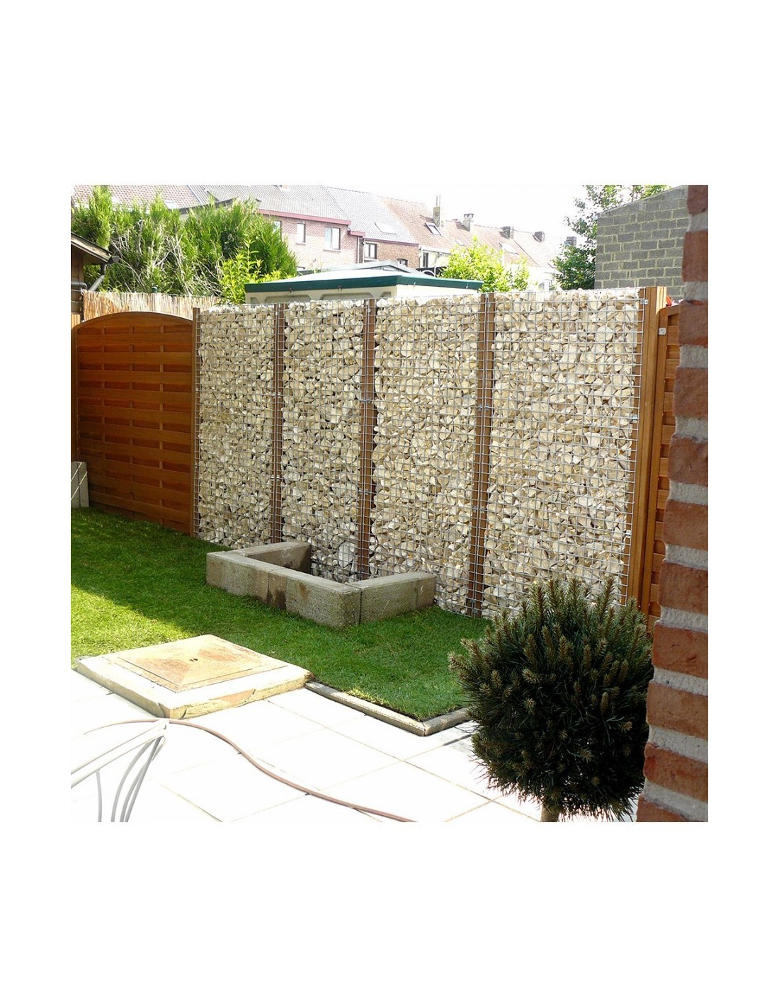 Clôture en gabions de 180 x 90 cm en mailles de 4,5 x 4,5 cm. Les connecteurs sont nécessaires pour visser les clôtures aux poteaux. Il vous est conseillé de choisir les fixations pour renforcer l’armature du Galva Stone. Vous pouvez placer plusieurs grilles les unes au-dessus des autres.