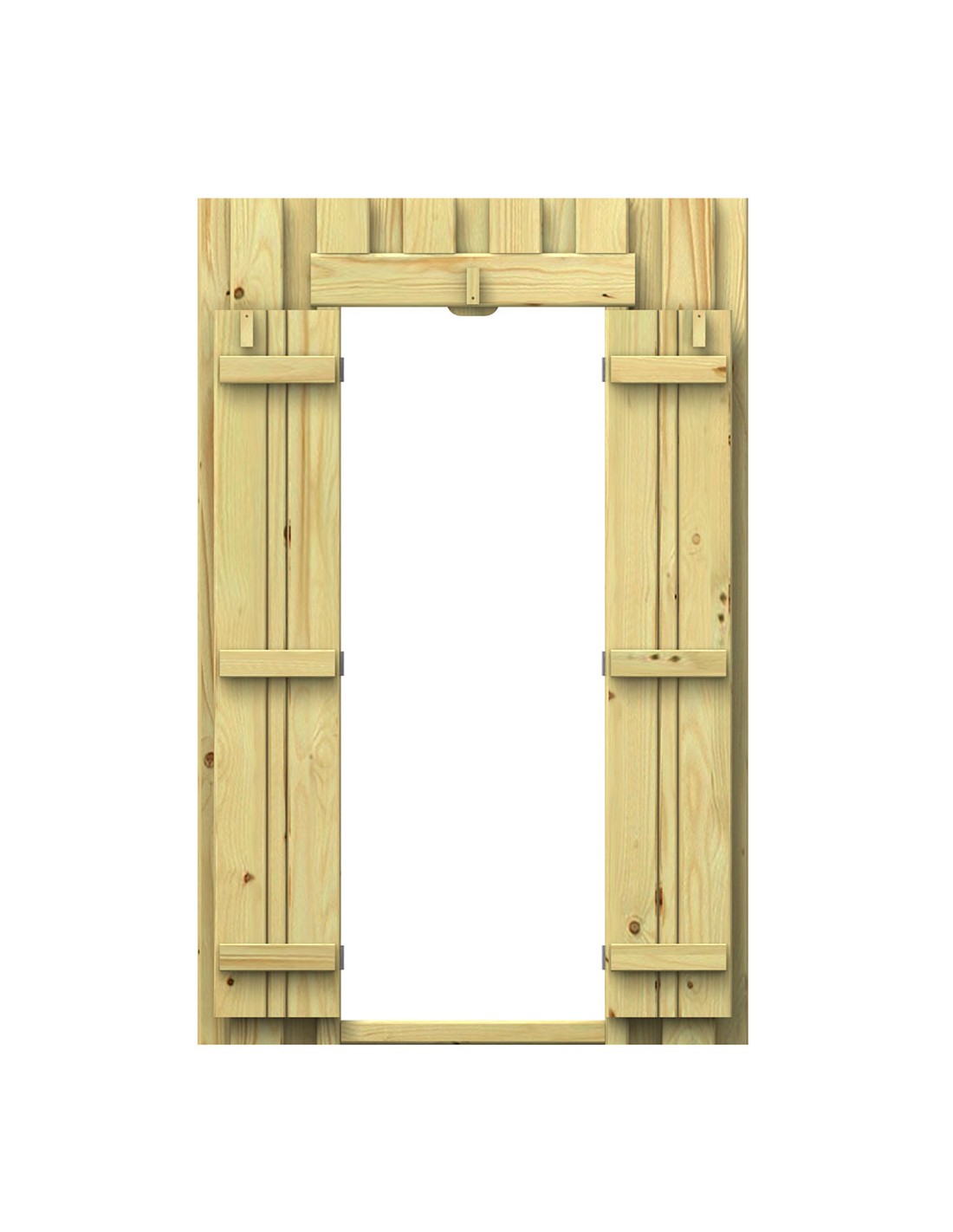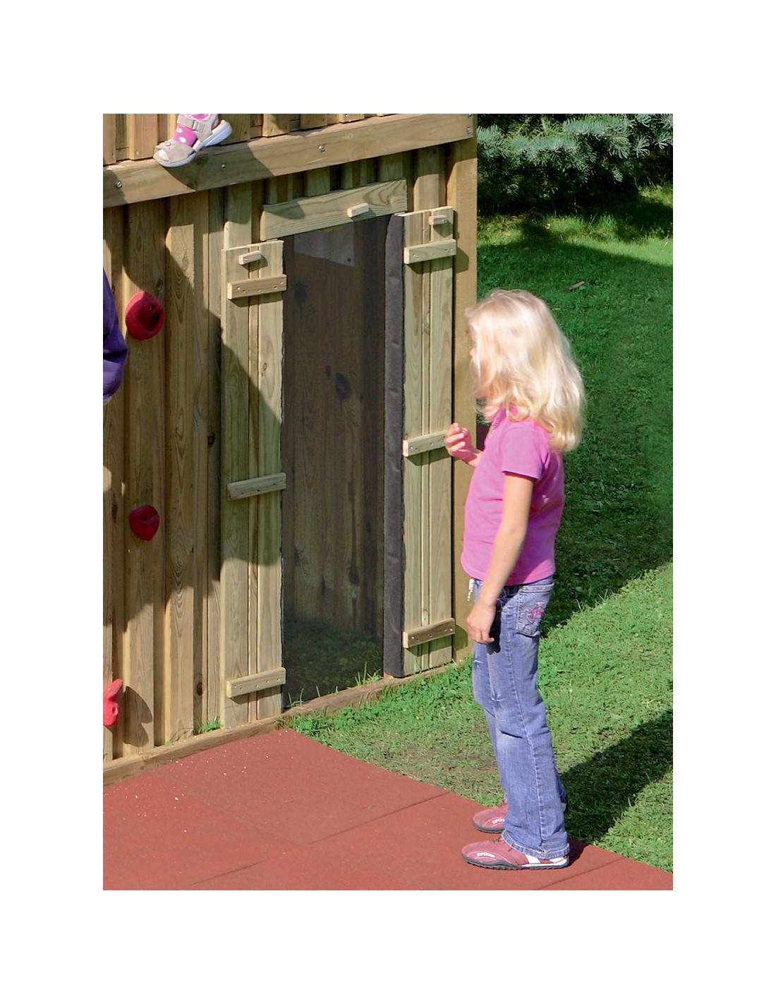 La paroi avec porte et volets, l’ensemble en bois résineux FSC®, peut être ajoutée en haut ou en bas de la tour. Pour d’autres combinaisons possibles, veuillez vous reporter à la notice de montage. Selon l’emplacement du montage, une poutre de système supplémentaire peut être nécessaire pour la fixation. La paroi avec porte est équipée de charnières en acier inoxydable et d’une protection contre le pincement des doigts d’enfant.