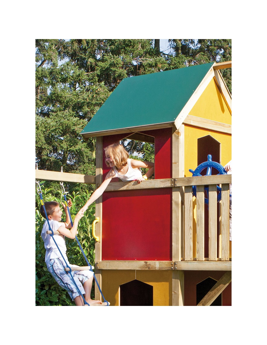 La lasure utilisée est spécialement pour les jeux d’enfants et sans danger pour l’environnement. Lors de la livraison des jeux d’enfants la lasure est encore très intensive, mais elle va s’éclaircir sous l’effet du rayonnement UV. Sans entretien, les parois restent lisses.