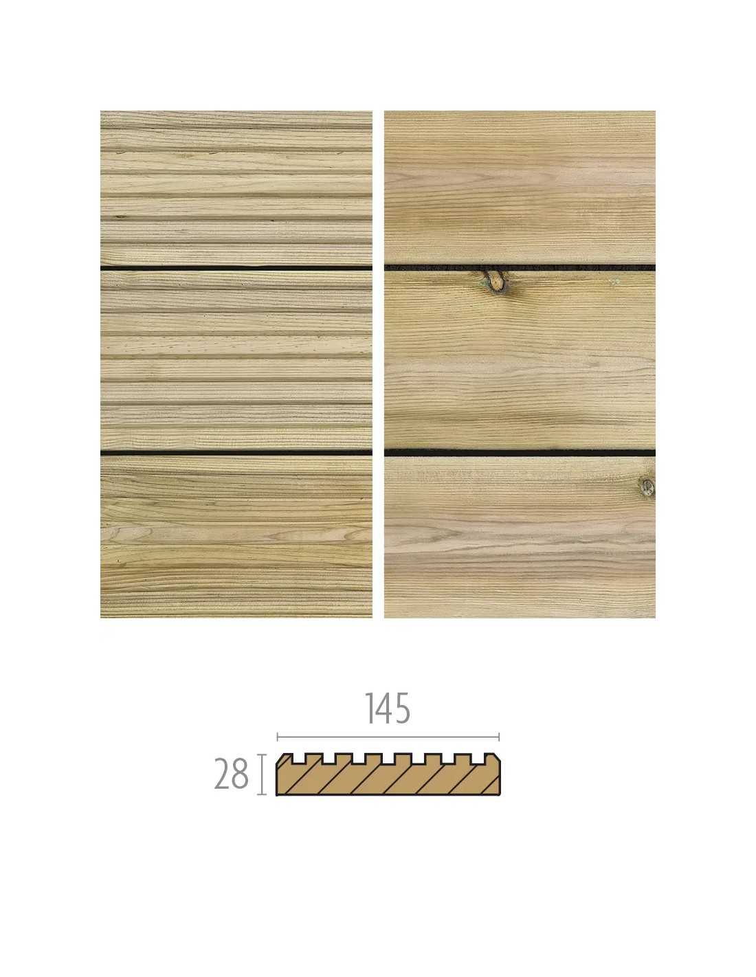 Planche de terrasse en Pin Traité lisse 28x145 mm avec ou sans vis et chevrons. Prix au m2.
