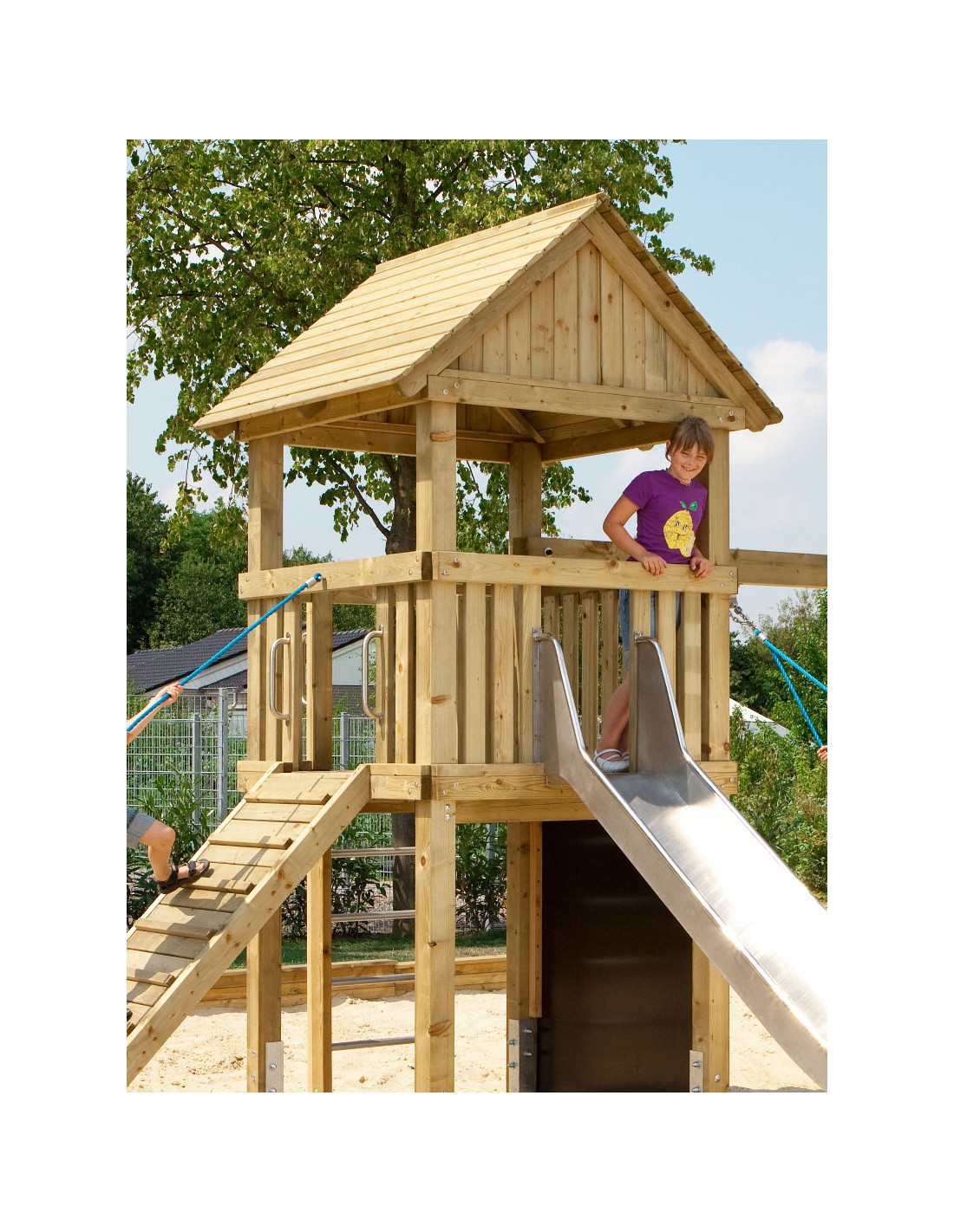 Le toit en bois est fabriqué en bois de conifères imprégné sous pression et sans chrome. Le toit est solidement construit avec des planches à rainure et languette de 2,4 cm d'épaisseur et ne nécessite pas de couverture de toit supplémentaire.