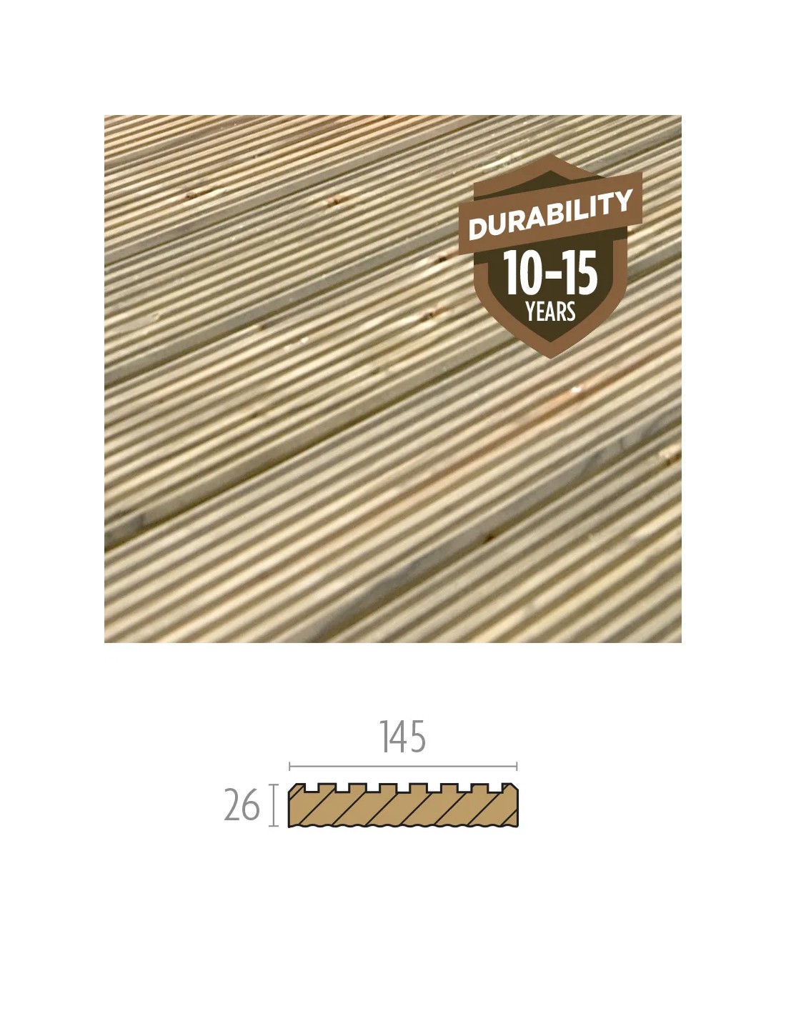 Onze latten in lariks voor uw terras hebben een afmeting van 26 x 145mm en zijn gegroefd. Lariks heeft een goede natuurlijke weerstand, zelfs als het niet wordt behandeld (Natural duurzaamheid Klasse 3:10 tot 15 jaar). De duurzaamheid is de maat van een doorsnede van 50 mm x 50 mm hout die onbeschermd in de grond achterblijft. Wanneer onbehandeld en NIET in contact met de grond, kunt u een levensduur van 50 tot 60 jaar verwachten. Wanneer behandeld en buiten, is de levensverwachting van 100 jaar.